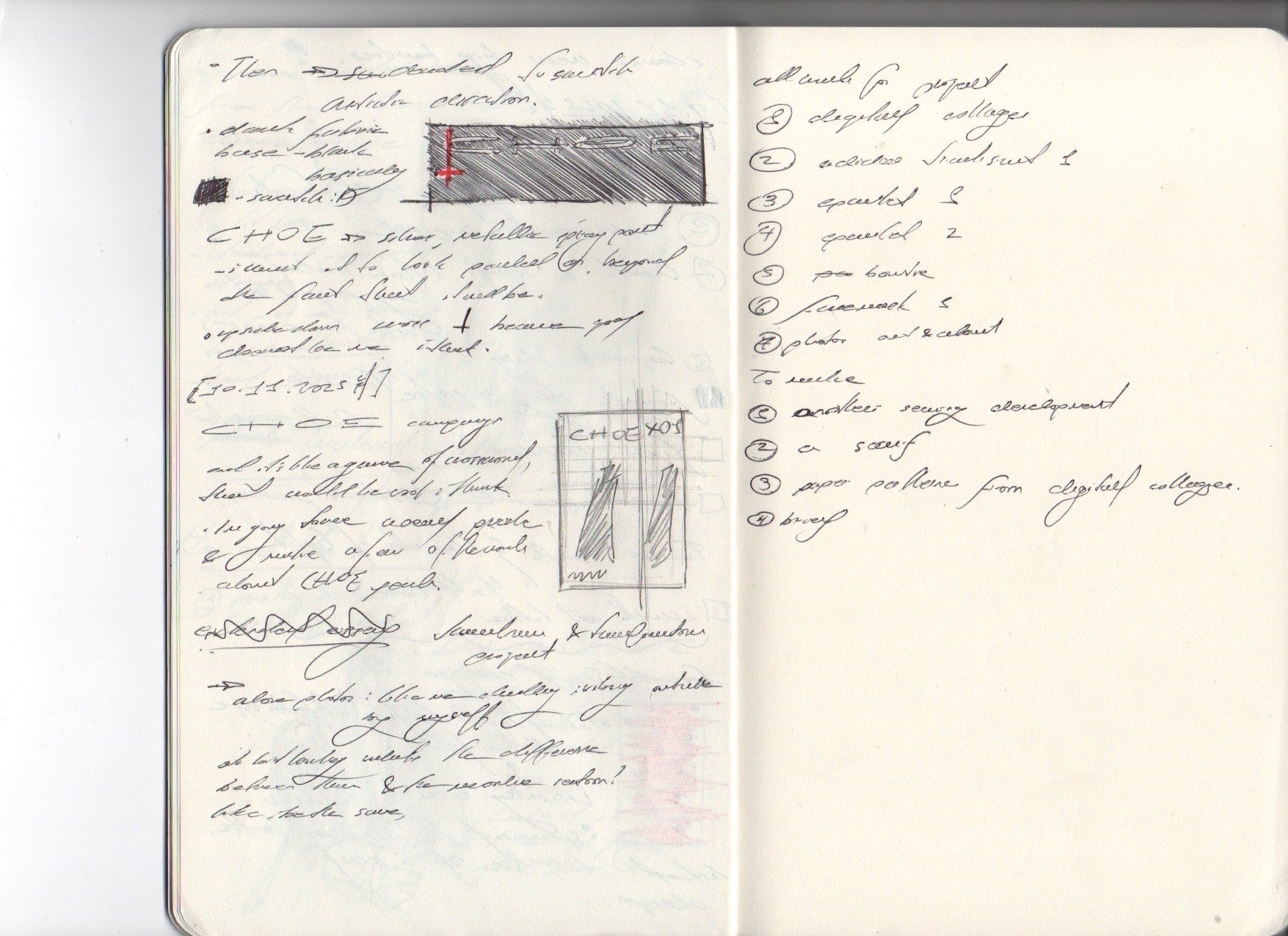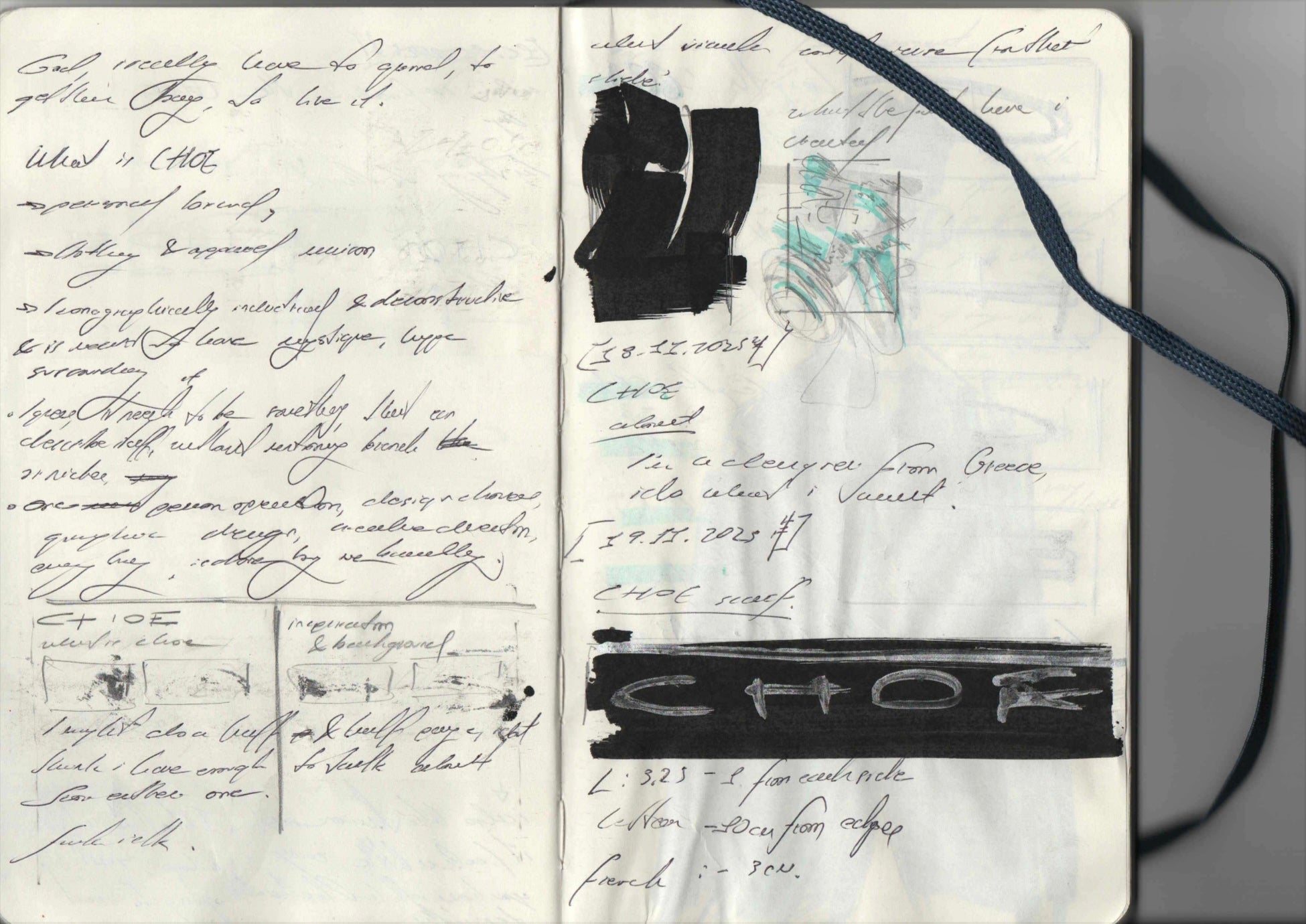 theres also the draft for a campaign i made for CHOE on the left page. but yeah i also got the notes on like how i wanted choe to be either metallic or white, just annotations on the color pallet in general
