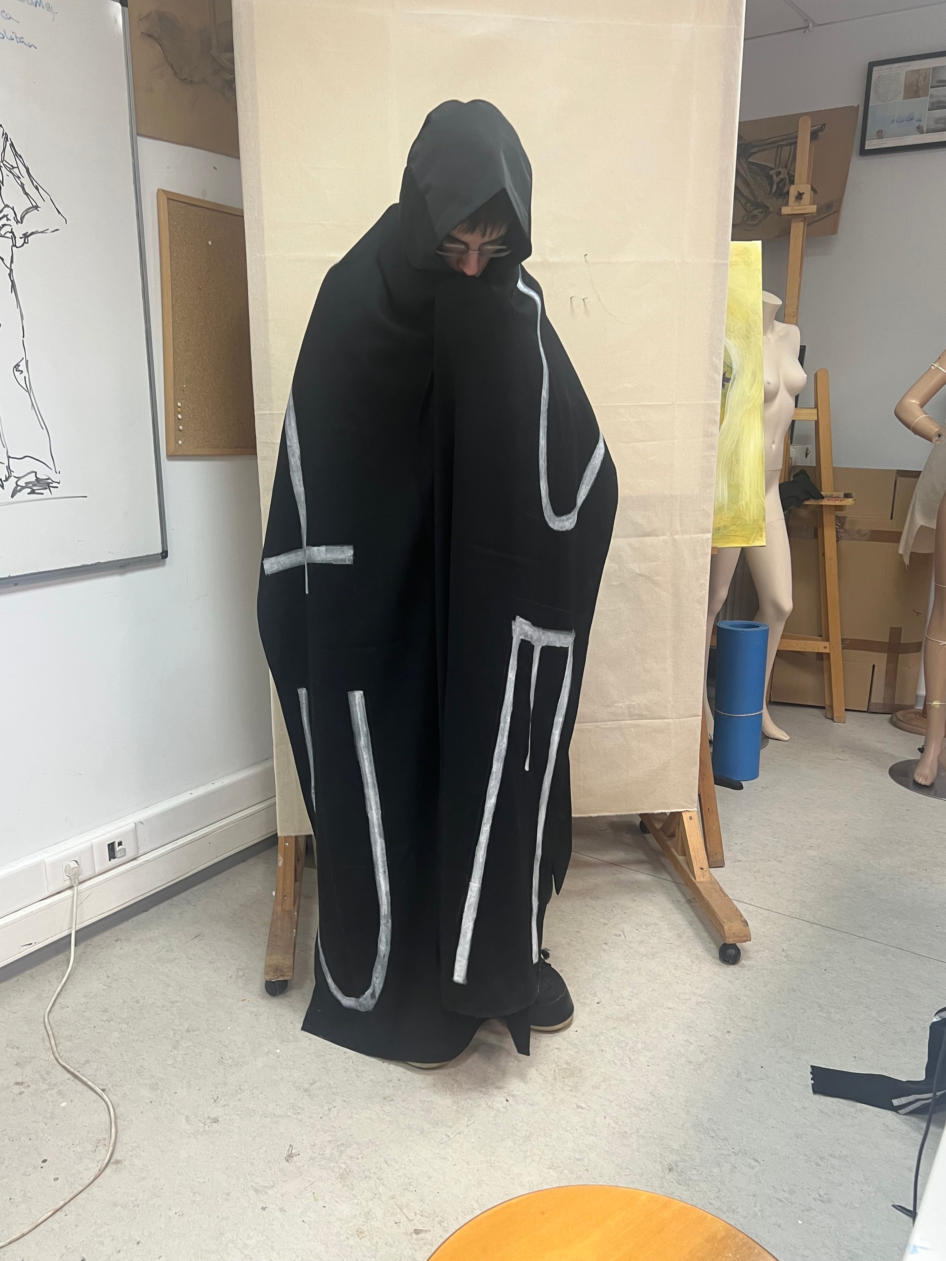 omg vulture type shit hahahah nah man kill yourself. ok well, this is just the best picture i have of me wearing it at the moment so you gotta deal with what you got yeah? i kind of just wanted to show its size in this picture, its long as fuck, ended up coming to 3.20 meters in length, super wide as well. you can see the letters in this picture as well, i was wondering, you know i would like for them to be a little thicker, a good amount actually, i dont know in the end, this is just a prototype you feel me, maybe some more variations in width to kind of accentuate that hastily tagged feeling you get me.