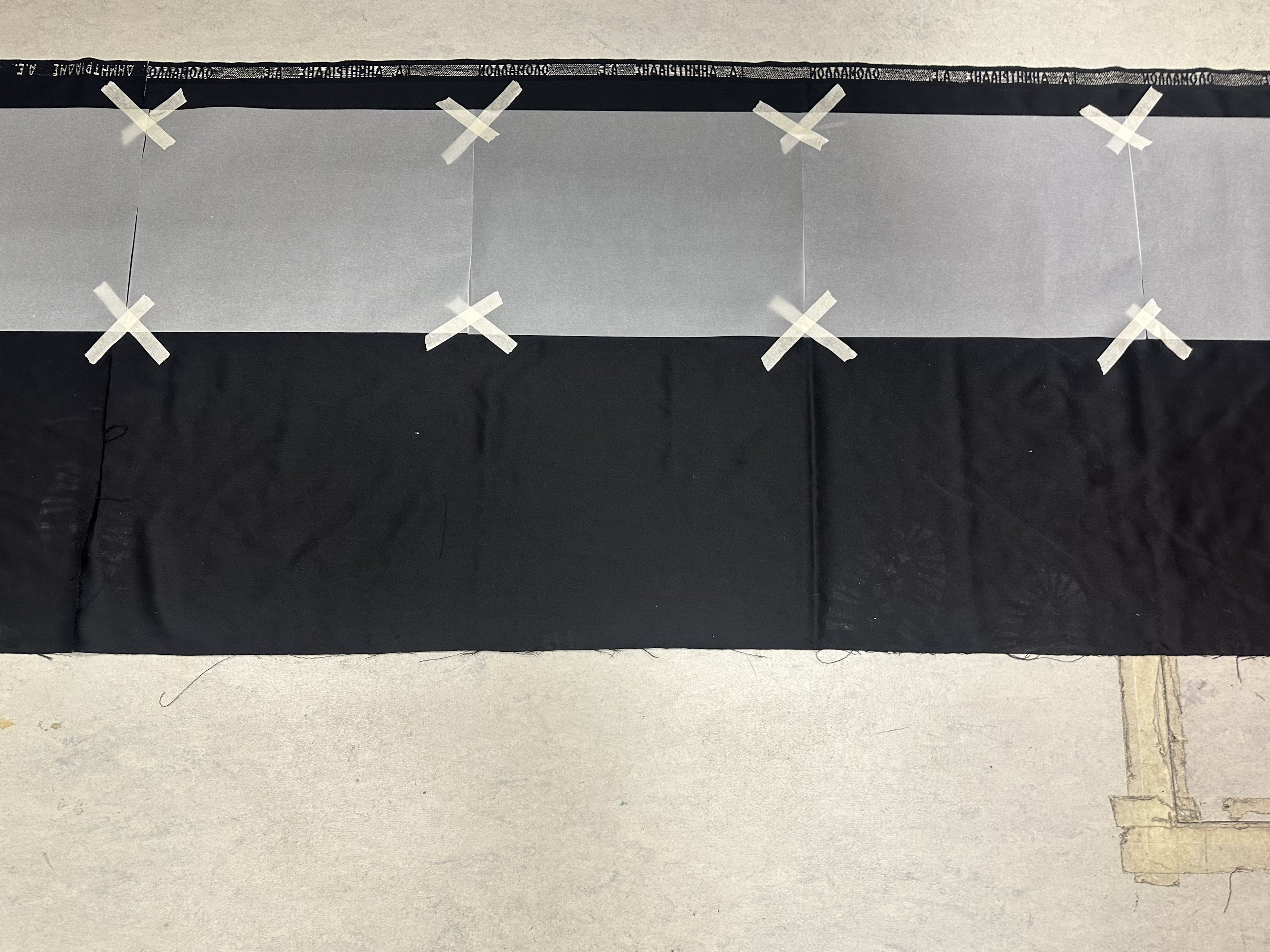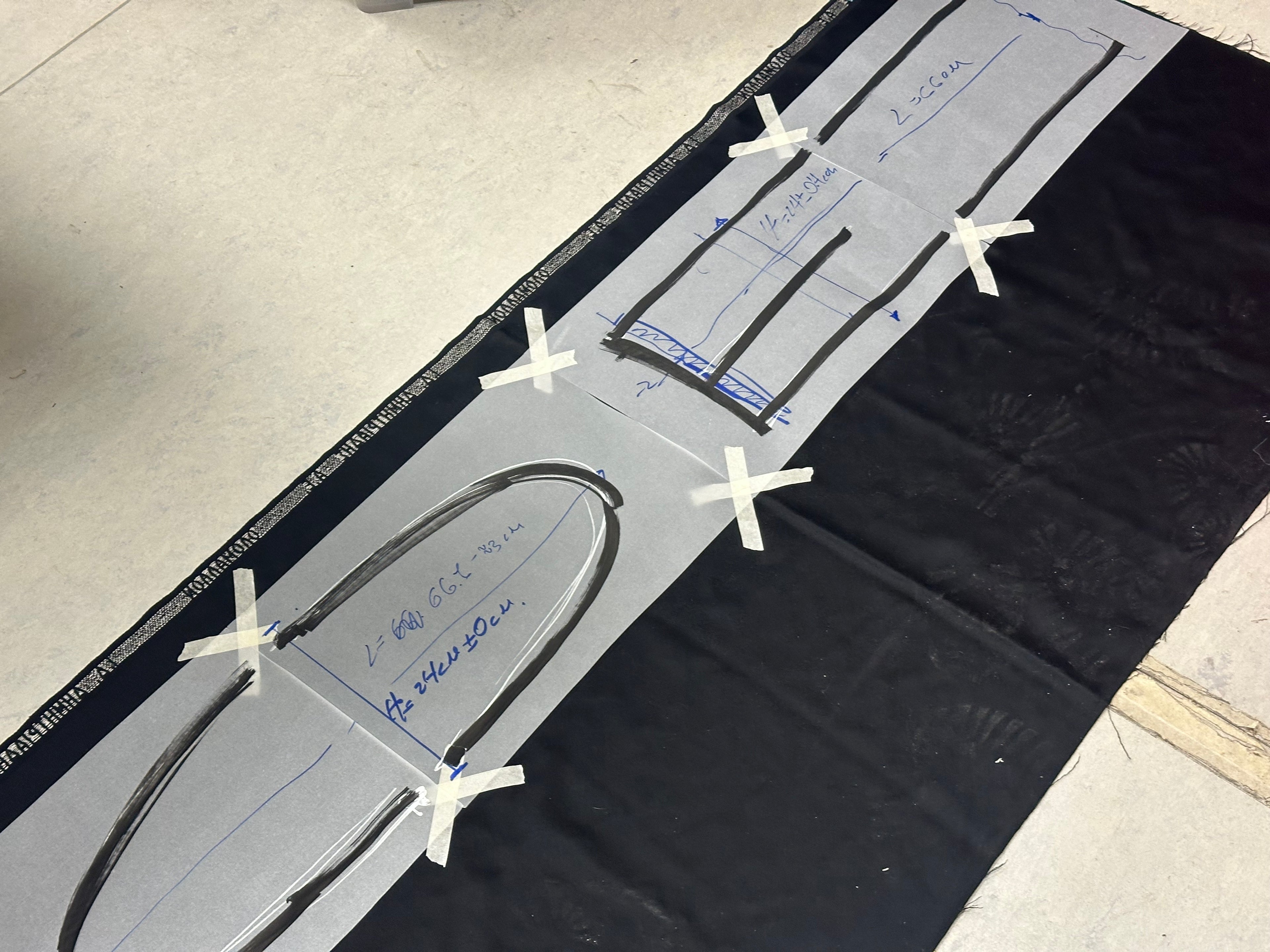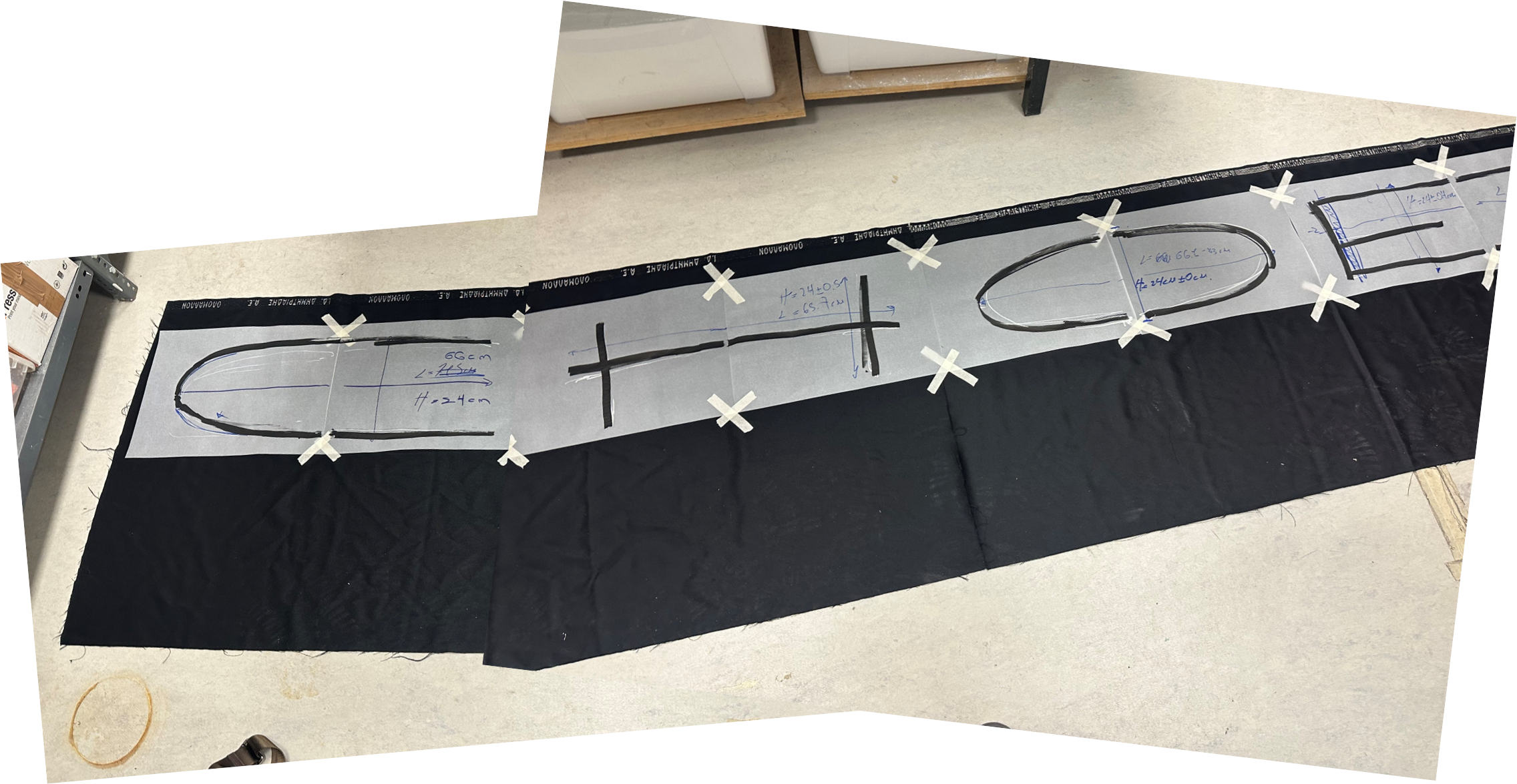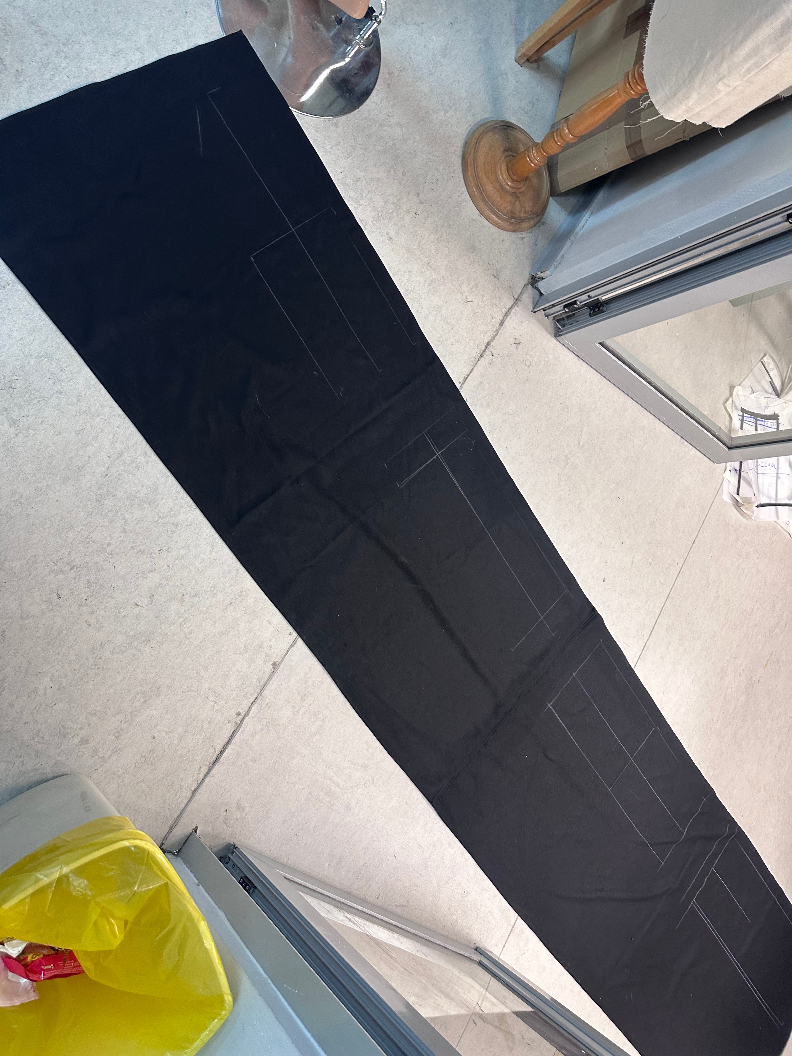 after finishing with all that i went on to the actual like practical part of the creation. i laid the two pieces of fabric down, measured them to double check the 3.25m length i had got earlier and started laying down tracing paper.
