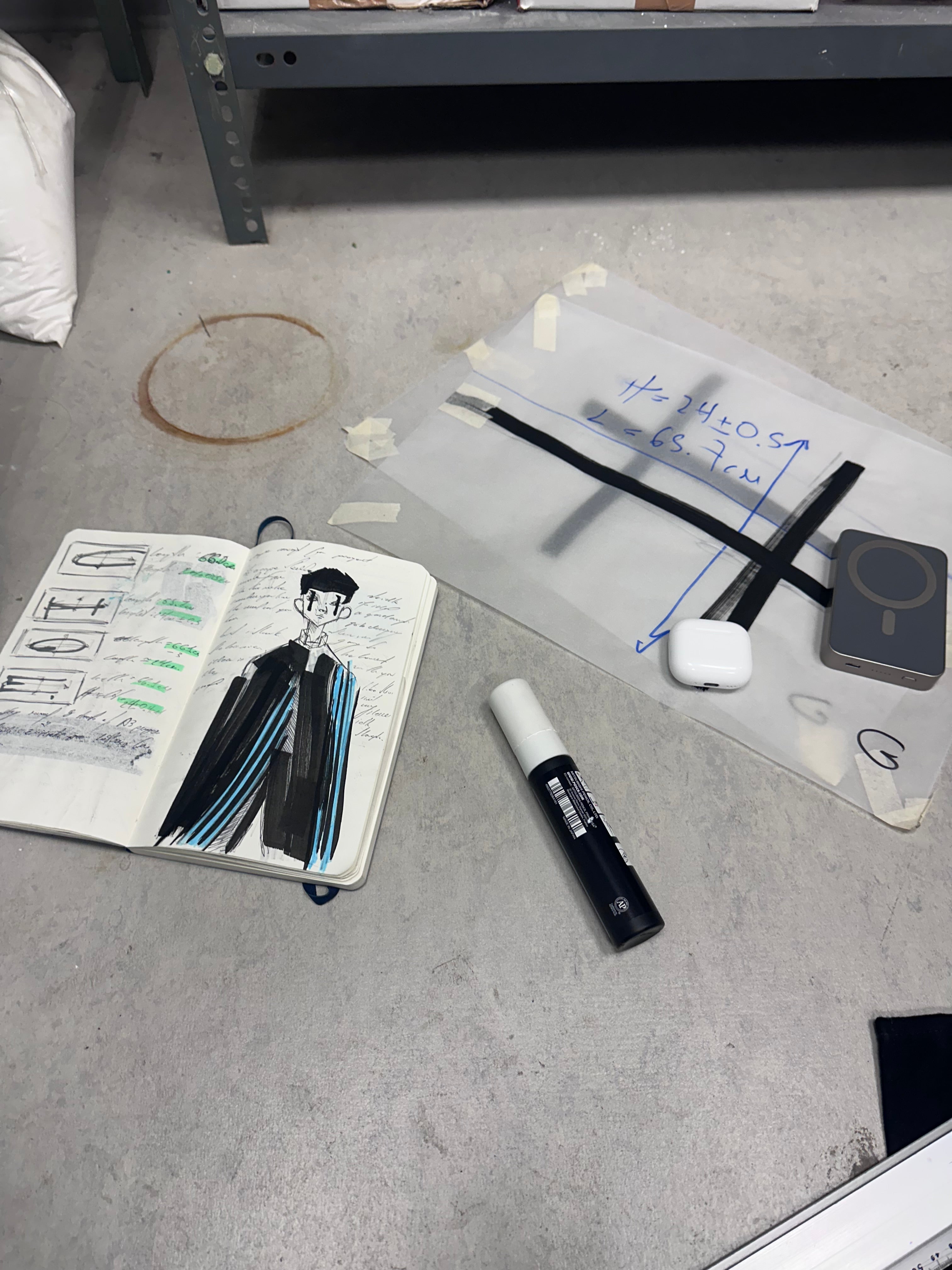 this is a cute photo, my sketchbook, thas where i got the dimensions for the letters, my white posca with which i did the letters, airpods, powerbank and the tracing paper. what i basically did was, after sewing the two pieces together, i laid my tracing papers back in place as they where, to map out the location and spacing of the letters.