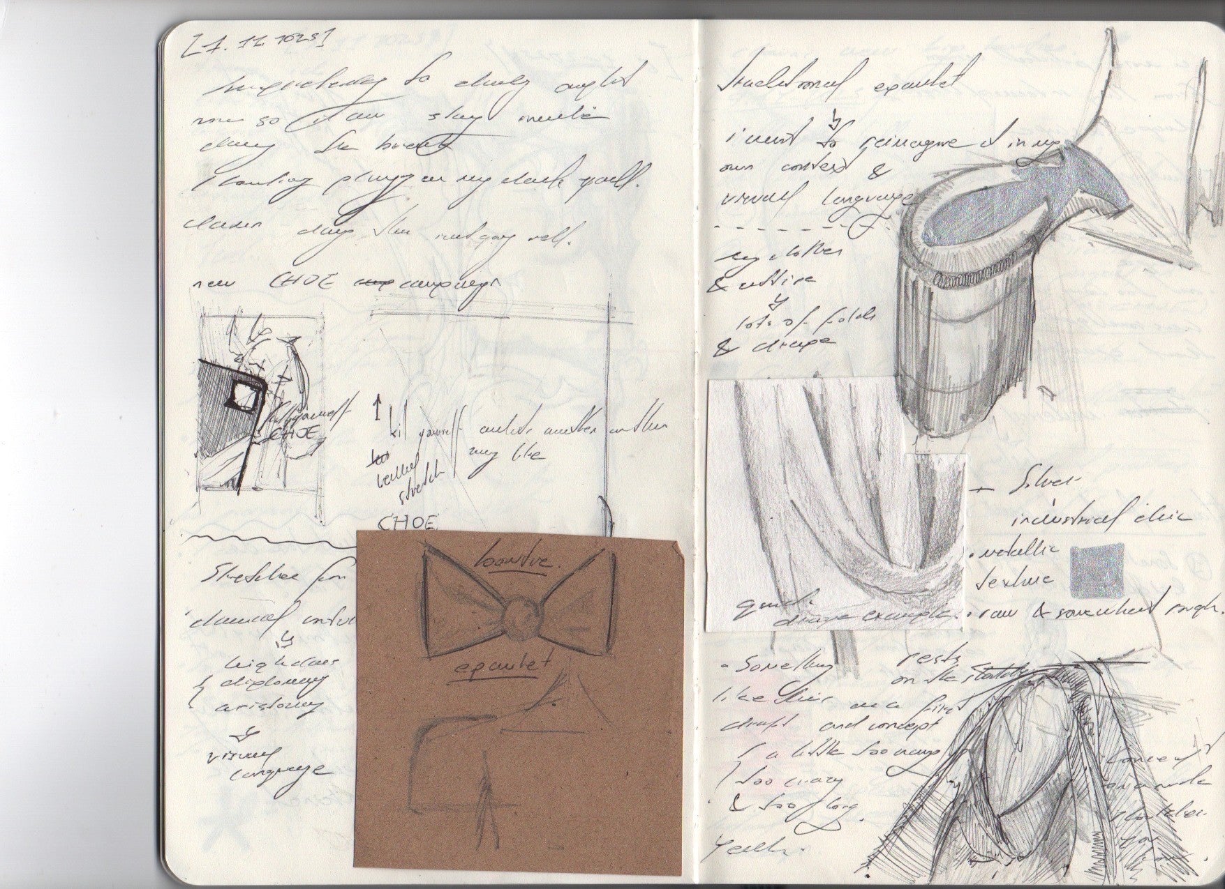 okokokok, this is for the same project for which i made the CHOE scarf. i was doing an analysis on symbols and motifs in like haute couture, specifically in reference to pierpaolo piccioli due to his recent appointment to balenciaga right. bowties and epaulets just came to mind you know, so i was like ok let me do something related to that, however, i wanted to add my own touch, do my own shit. i was thinking like, ok what if i make it be like fluid, like drapey, that would be cool yeah? so thats what i did. i thought it would be kind of oxymoronic to the nature of epaulets, that are like hard, and i thought this kind of irony is tight i think. i cant say i love this spread, i dont really like how it looks too much, too much pencil, unorganized, scrappy, like, in a way thats way different from pages i actually fuck with. the brown paper too, like, so untasteful, but whatever. whatever works work i guess.