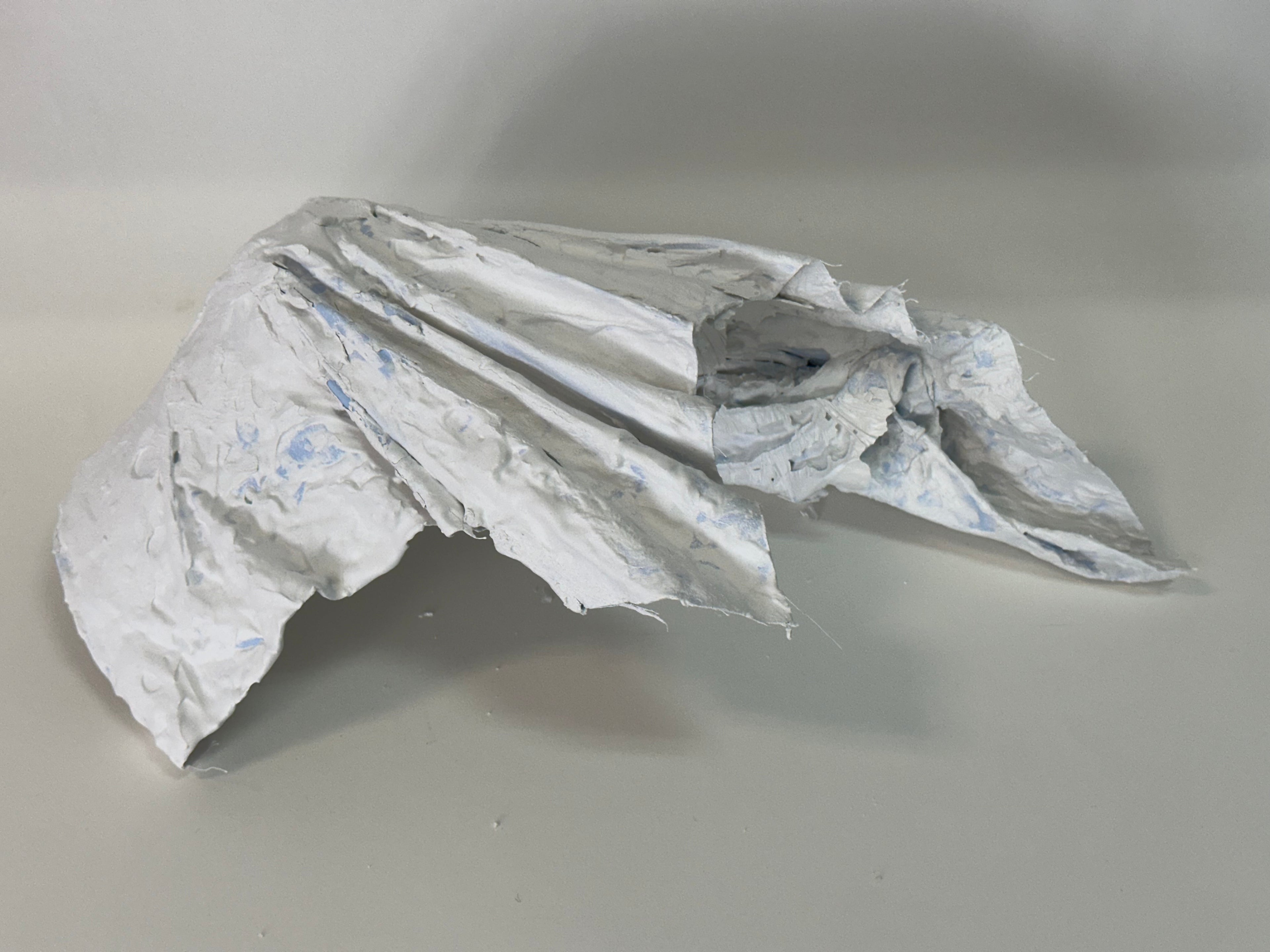 looking back, i feel i should have put like a base behind the plaster, because, as you can kind of see in the picture attached, theres like awkward and abrupt folds that kind of take away from my initial intention, so looking back thats something i should have fixed, but its still good non the less i like it. my tutor said that the cling wrap and the chest of the mannequin are distracting, i dont know, i dont really care.